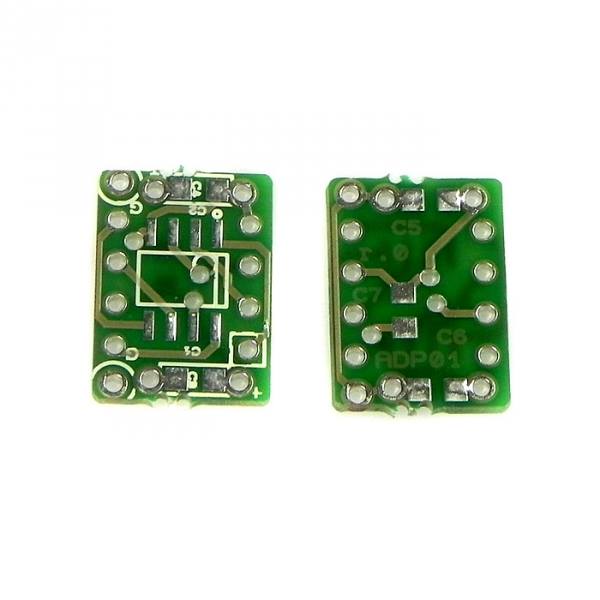 ADP01 tar en ytmonterad singel operationsförstärkare i SOIC8-kapsel och gör om den till en hålmonterad singel operationsförstärkare i DIL8-kapsel. Monterad ser du den överst till höger på bilden här invid.
