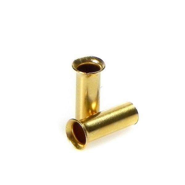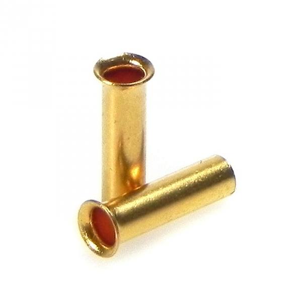 När en mångtrådig kabel skall skruvas fast i en kontakt bör man samla och pressa samman ledarna med en crimphylsa. Resultatet blir att alla kabelns ledare kommer med och att skruven inte kan pressa ledare åt sidan utan hela kabeln får en stabil infästning i kontakten. Slutresultatet blir ett bättre ljud. Detta gäller vid alla typer av mångtrådiga kablar som skall termineras med en enkel skruv. I många kontakter har konstruktörerna byggt in egna lösningar på problemet med många trådar. I dessa fall behövs crimphylsan inte. För bästa resultat skall crimphylsan pressas runt ledarna med en crimptång. Crimphylsor skall inte användas vid lödning. |